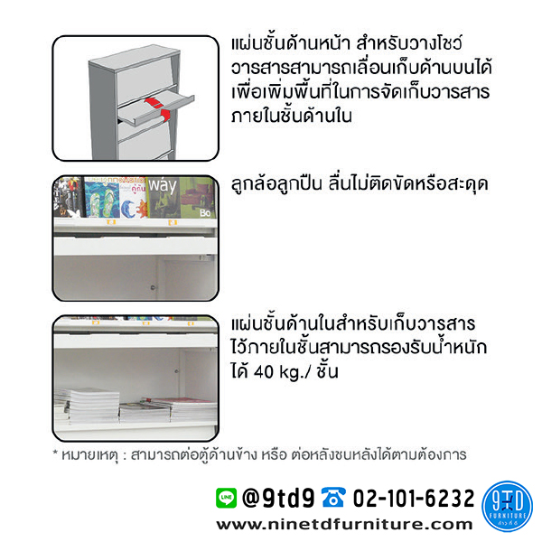 แผ่นชั้นด้านหน้าสำหรับวางโชว์ สามารถเลื่อนเก็บด้านบนได้
