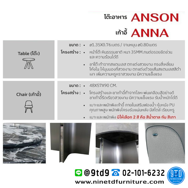 - โต๊ะ รุ่น Anson ขนาด : Ø135 x H76 cm. / จานหมุน Ø80 cm. = 1 ตัว