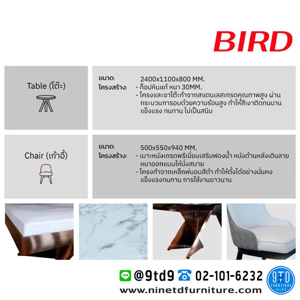 ชุดโต๊ะอาหาร 8 ที่นั่ง รุ่น เบิร์ด (ฺBird)