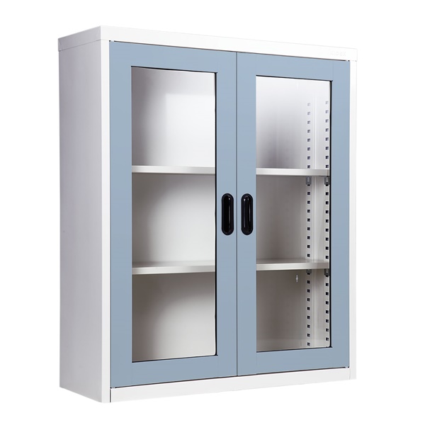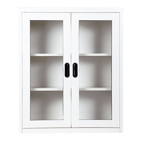 Half height glass door cabinet with 2 adjustable shelves.