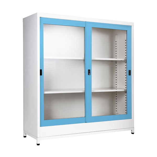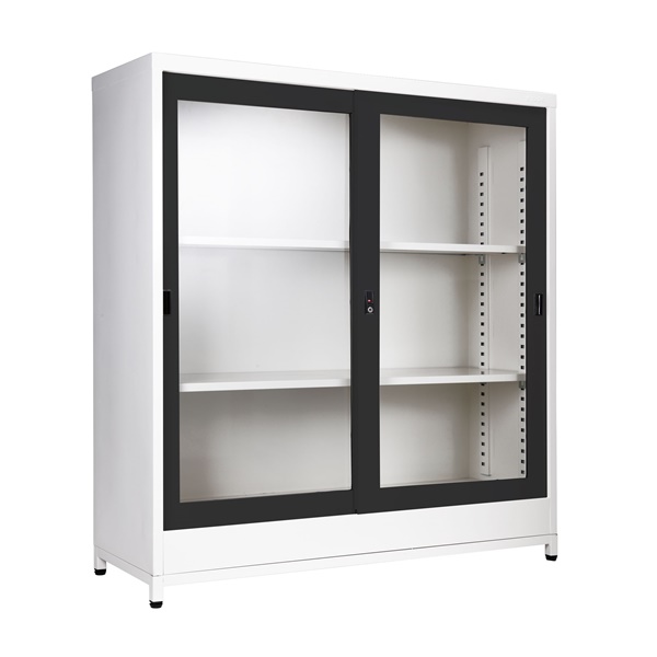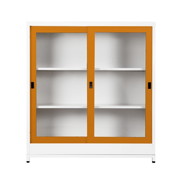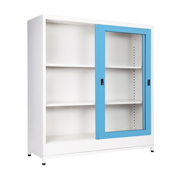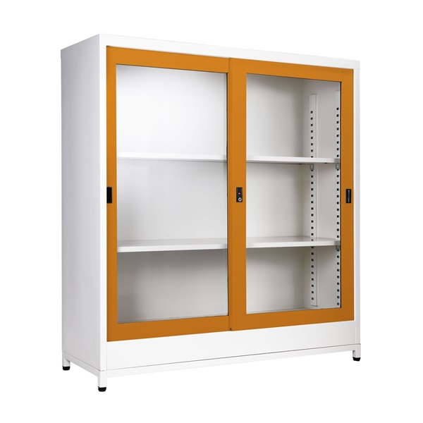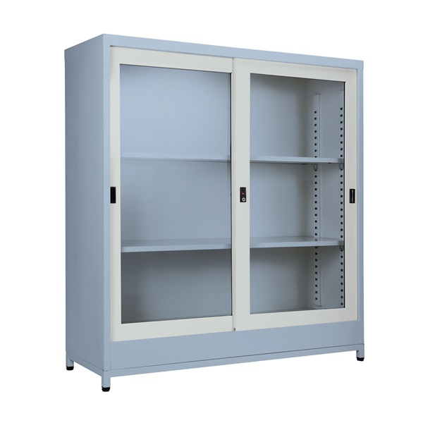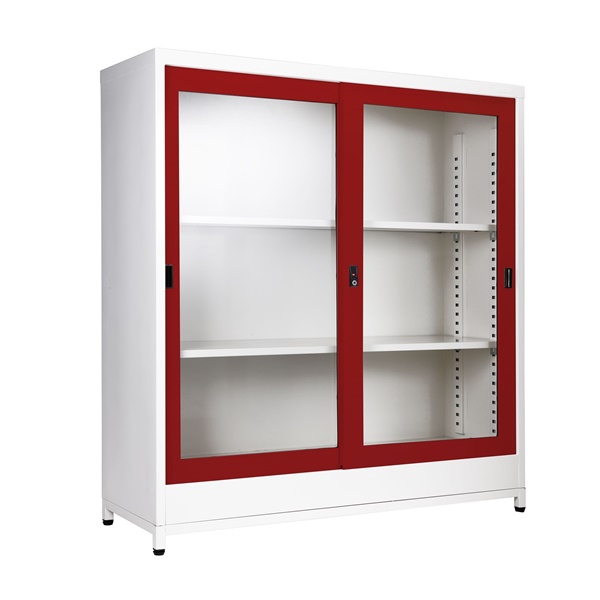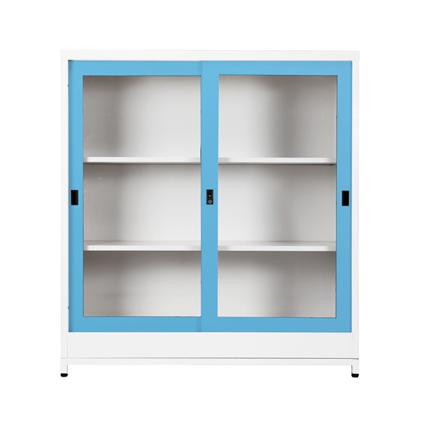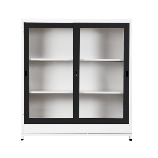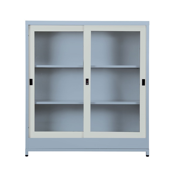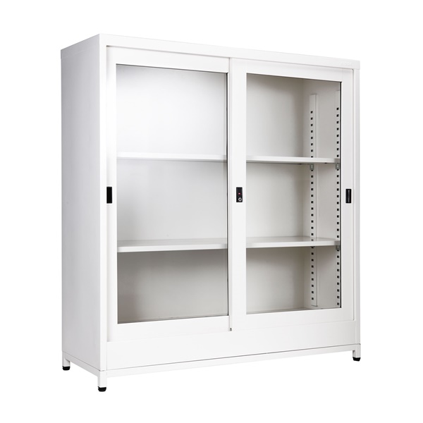 Sliding glass door cabinet with 2 adjustable shelves and keylock including base.