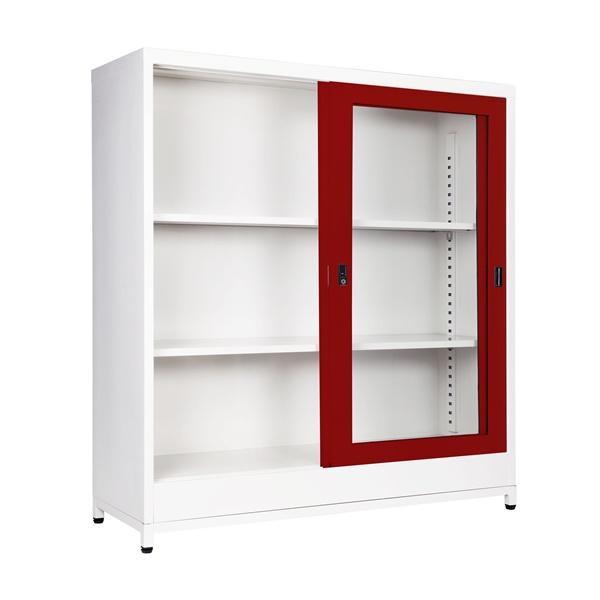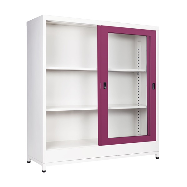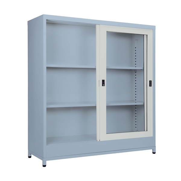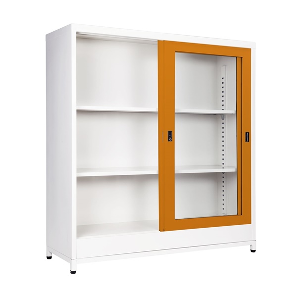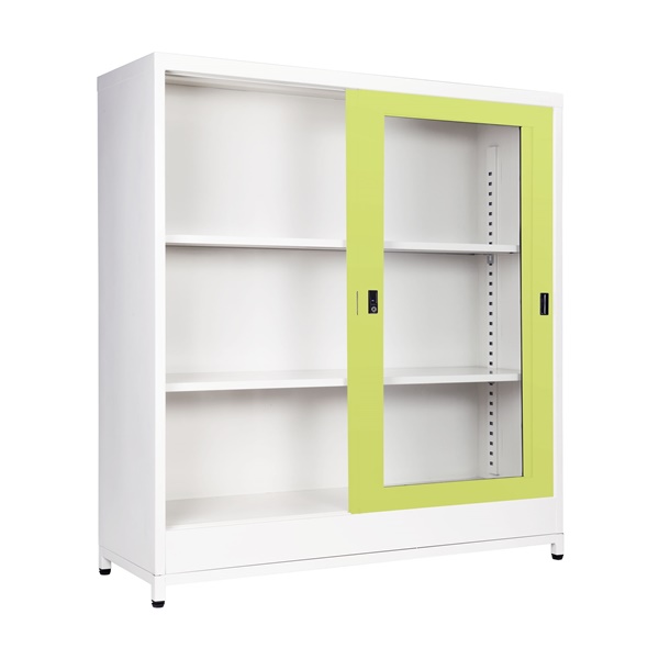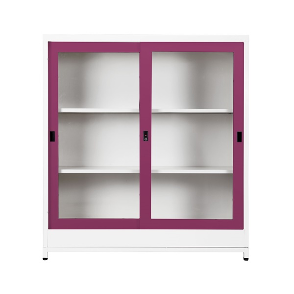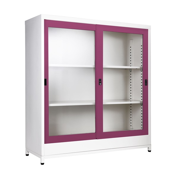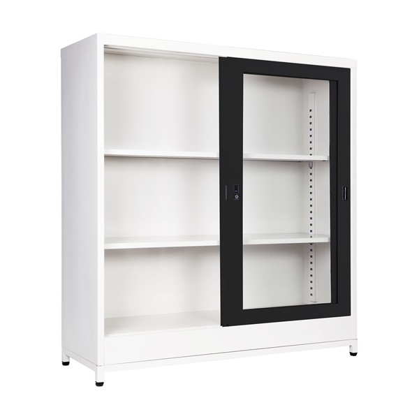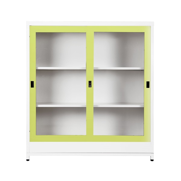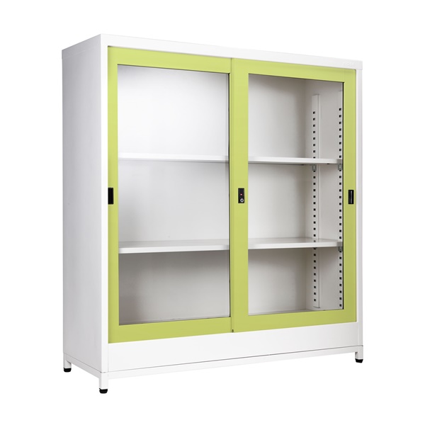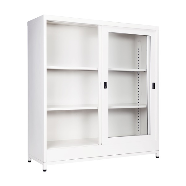 Sliding glass door cabinet with 2 adjustable shelves and keylock including base.