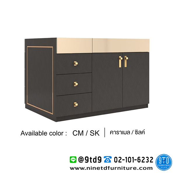 - ตกแต่งหน้าลิ้นชักด้วยกระจกเงาทองหน้าบานเปิดปุ่มจับซิงค์สีทอง แผ่นข้างฝังคิ้วอลูมิเนียมสีทอง