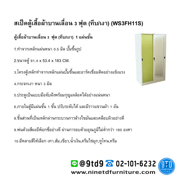 ตู้เสื้อผ้าบานเลื่อนสูง(ทึบ/กระจกเงา) 3 ฟุต WS3FH1