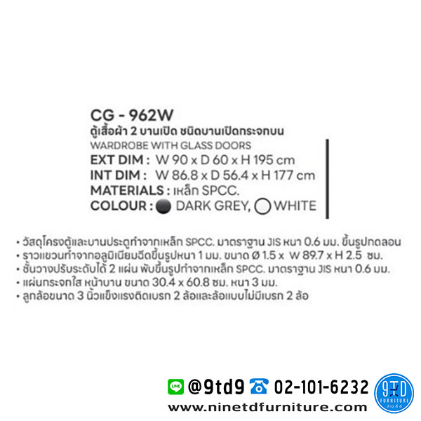 ตู้เสื้อผ้า 2 บานเปิด ชนิดบานเปิดกระจกบน รุ่น CG-962W