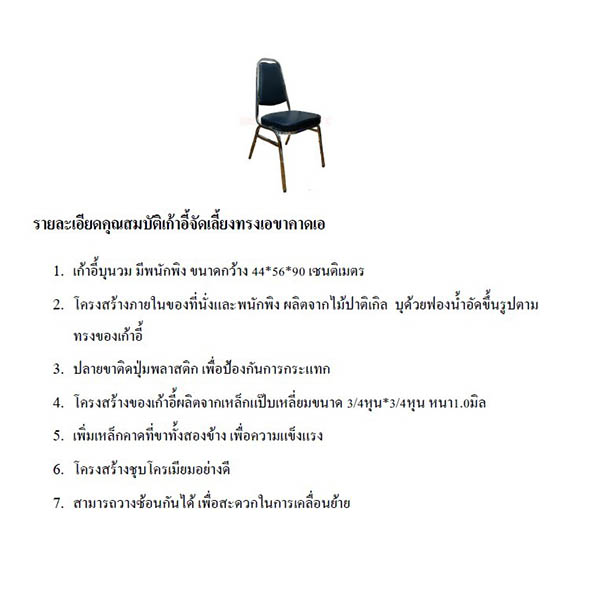 2. โครงสร้างภายในของที่นั่งและหลังพิง ผลิตจากไม้ปาติเกิล หนาไม่น้อยกว่า 12 มิล บุด้วยฟองน้ำรูปตามทรงของเก้าอี้