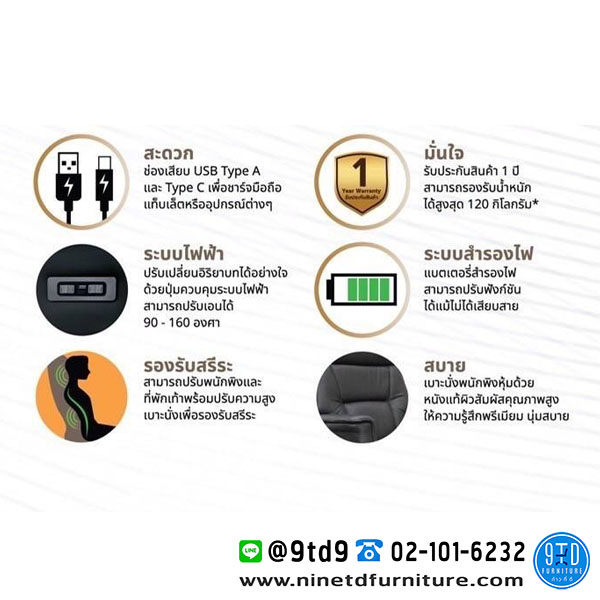 - ด้านขวา ปุ่มกดด้านขวาปรับเอนพนักพิงและยกที่พักเท้าด้วยระบบไฟฟ้าพร้อมช่องเสียบ USB Type A และ Type C เพื่อชาร์จมือถือแท็บแล็ตหรืออุปกรณ์ต่าง ๆ