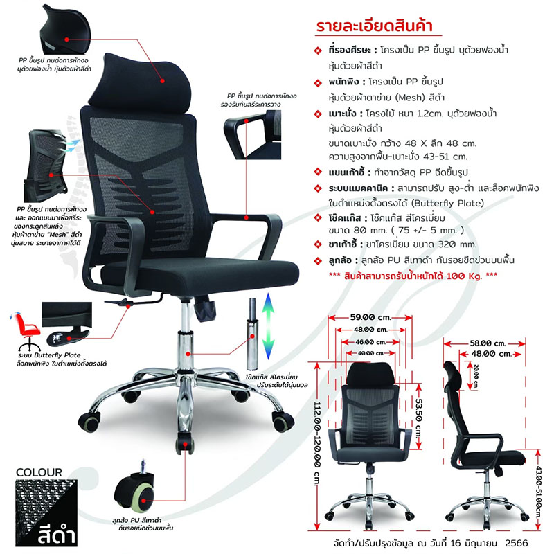 - โครงพนักพิงเป็น PP ขึ้นรูป หุ้มด้วยผ้าตาข่าย สีดำ ระบายอากาศได้ดี มีความยืดหยุ่นได้ดี