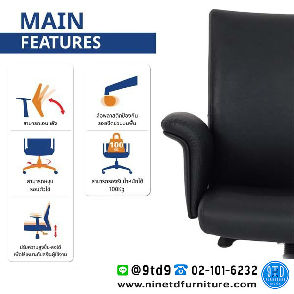 - สามารถเอนหลังได้โดยสามารถปรับความหนืดเพื่อให้เหมาะกับน้ำหนักของผู้ใช้งาน