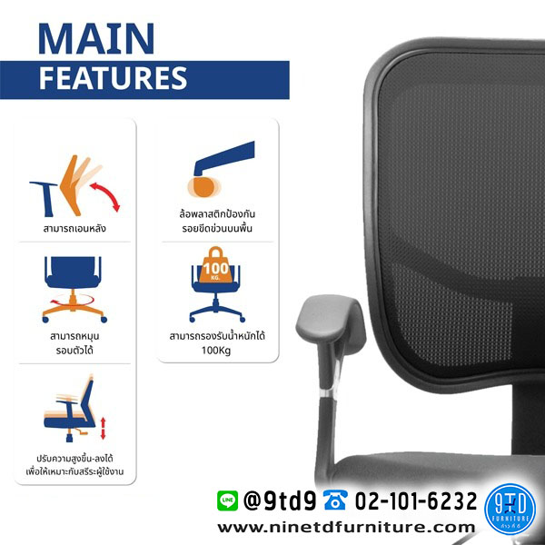- โครงสร้างพนักพิงผลิตจากพลาสติกหุ้มด้วยผ้าตาข่าย