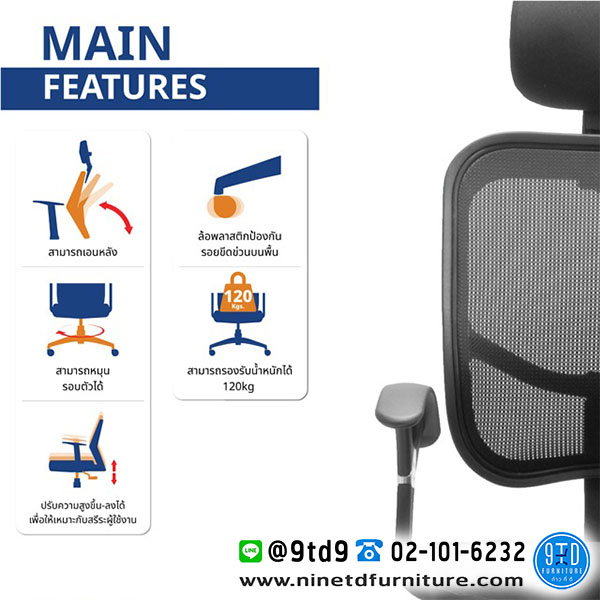 - โครงสร้างพนักพิงผลิตจากพลาสติกหุ้มด้วยผ้าตาข่าย