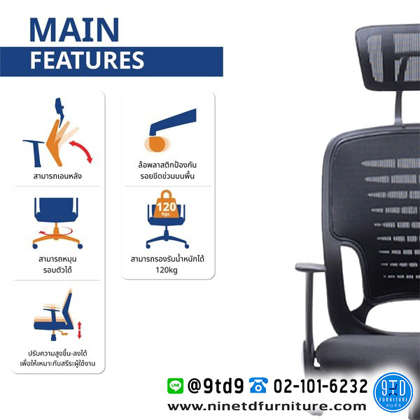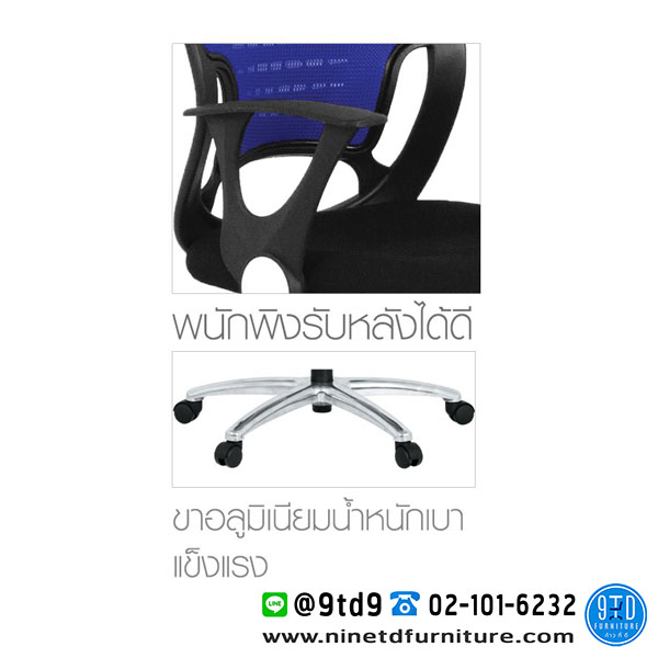 - โครงสร้างพนักพิงผลิตจากพลาสติกหุ้มด้วยผ้าตาข่าย