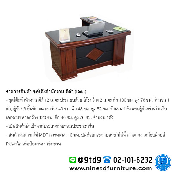 – ชุดโต๊ะสำนักงาน ดีด้า 2 เมตร ประกอบด้วย โต๊ะกว้าง 2 เมตร ลึก 100 ซม. สูง 76 ซม. จำนวน 1ตัว, ตู้ข้าง 3 ลิ้นชัก ขนาดกว้าง 40 ซม. ลึก 48 ซม. สูง 52 ซม. จำนวน 1 ตัว และตู้ข้างสำหรับเก็บเอกสารขนาดกว้าง 120 ซม. ลึก 40 ซม. สูง 76 ซม. จำนวน 1 ตัว