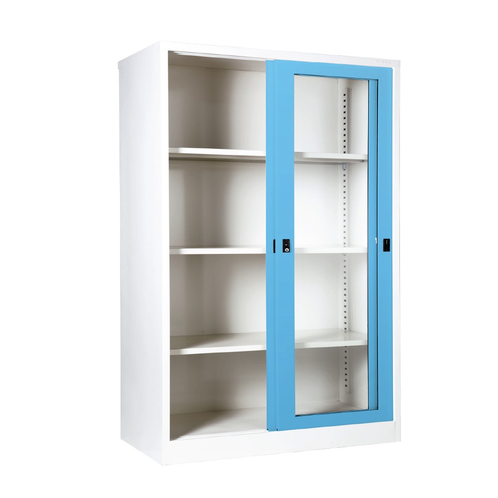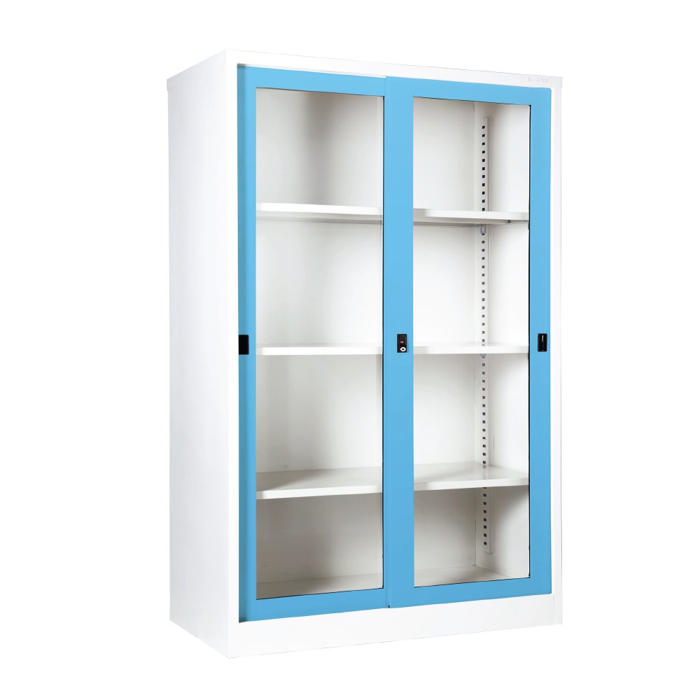 Full height sliding glass door cabinet with 3 adjustable shelves and keylock.